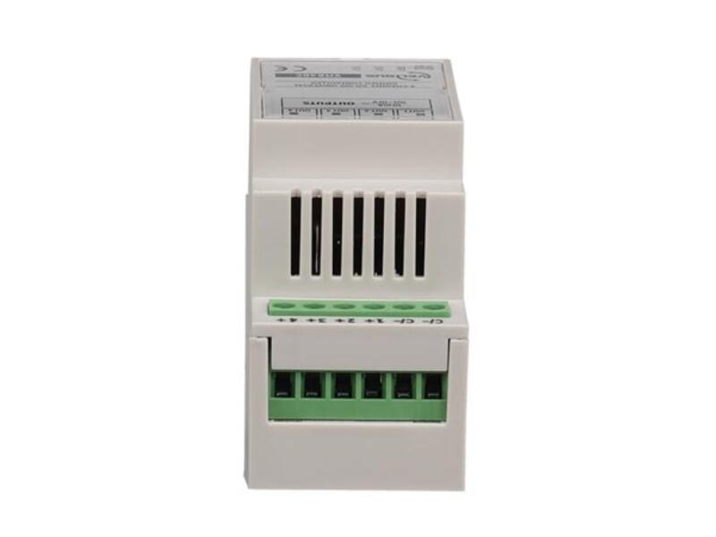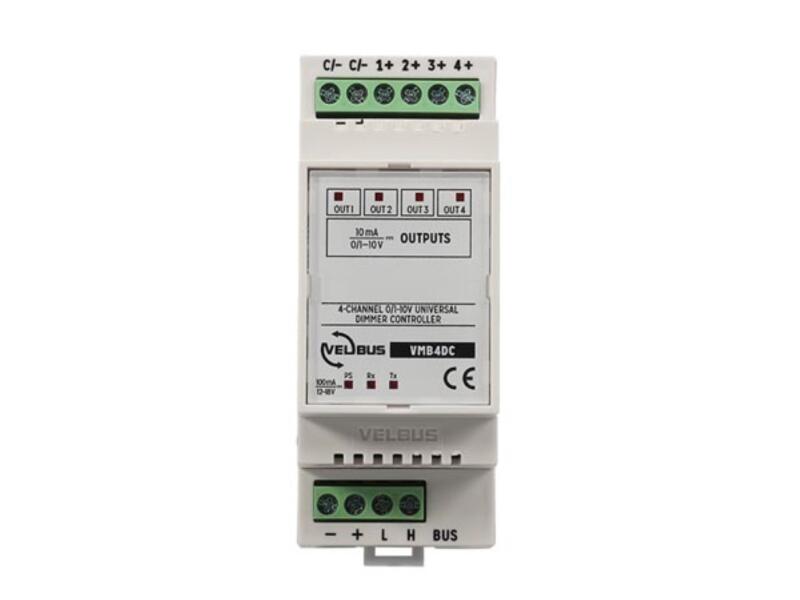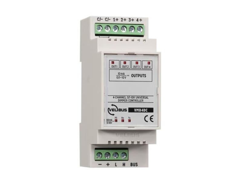 Can be used to control various dimmers or fixtures. Create an atmosphere which suits you best or let your lights dim slowly to avoid unexpected surprises. It is also possible to simulate a sunrise which makes waking up a lot more pleasant! Programmable with Velbuslink version 8 or higher. Configuration: via PC. Features Different operation modes: moment control, on/off control, timers, slow on/slow off, dimming, moods… Free programmable timer functions (using Velbus Link software and USB/RS232 interface: VMB1USB, VMB1RS or VMBRSUSB) 0 to 10V output or 1 to 10V output possibility 4 independent adjustable channels 250 possible id addresses On board buttons for testing purposes Velbus® connection Specifications 2 Modules wide on the DIN rail required power supply: 14V (12…18VDC allowed) firmware upgradeable through the Velbus system power consumption: 100mA max. (45mA standby)