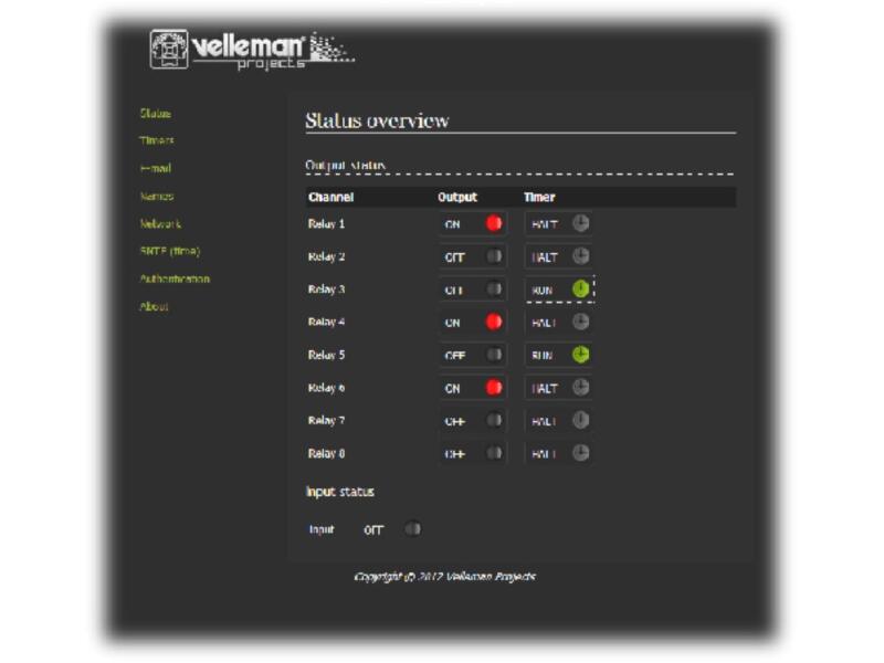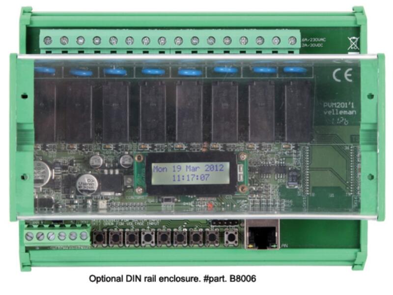 The card is web server based, so almost any internet browser can connect to the card, even mobile devices. No additional software installation required. The unit has numerous extra features such as reports by email at power up or input status change, programmable timers for each output, labeling of outputs etc… VM201 demo on YouTube Features IEEE 802.3 compatible Ethernet controller Supports 10 Base-T Port (10Mbps) Static IP or DHCP User definable NETBios name Use SNTP time server as real time clock (Internet time server) Sends E-mail at power up and input events (activated and/or deactivated) Web interface for configuration and operation TCP server (user definable port) LCD displays clock or network settings User definable names for all in- and outputs Multiple users (1 administrator and 3 additional users) Timer programs for all 8 channels Maximum 28 timer programs Scheduler: day, weekend, working days, every day and every day except Sunday Program actions: on, off or pulse (1 to 99 sec, 1 to 99 min or 1 to 99 hours) Specifications 8 relay contacts: 12A @ 30Vdc or 16A @ 230Vac 1 input: dry contact or voltage input 5…20Vac or dc power supply: 12Vac/500mA Extras information about the e-mail function If your internet provider uses an SSL or TLS connection, you will not be able to use the e-mail function. Android application This app allows you to control the Velleman VM201 Ethernet 8CH relay card from a remote location, via a wireless router. With this app you can:Turn a relay on or off.Monitor the status of each relay (on or off).Activate or deactivate the week program for each relay.Monitor the status of the VM201 input. Android application Apple Application This app allows you to control the Velleman VM201 Ethernet 8CH relay card from a remote location, via a wireless router. With this app you can:Turn a relay on or offTurn all relays off Monitor the status of each relay (on or off)Set a sleep timer for each relay (1s to 99h)Activate or deactivate the week program for each relayMonitor the status of the VM201 input Apple Application