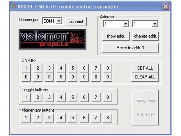 Simply connect to the USB port, install the driver and you are set. The transmitter works together with our K8056 card, equipped with an RX433N receiver module. Also our K8070 / VM119 one channel receiver can be used. In total a combination of 255 cards can be addressed, resulting in a maximum of 2040 channels !! Drivers and example software can be downloaded from our web site. A DLL is provided to create your own application. Specifications USB1.1 or 2.0 port compliant Up to 30m (depends on environment) Works with:RF transmit indicator LED8-Channel remote relay card: K8056 (+RX433N) One channel dual output RF receiver: K8070 / VM119 RGB controller with RF remote: VM151 Power LED USB port function LED’s 255 selectable addresses Transmit—test button 433MHz transmitter R&TTE compliant design Power supply : USB Dimensions: 80x55x35mm / 3,14×2,16×1,37″ Includes enclosure